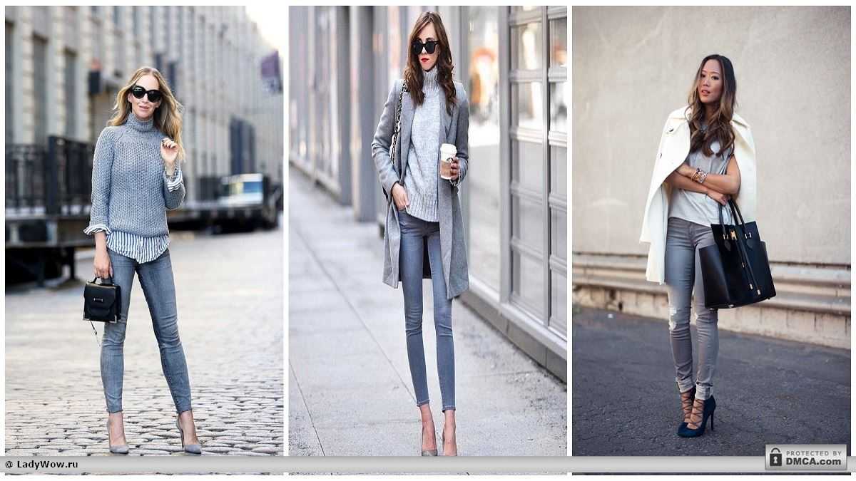 При подборе ансамбля с серыми джинсами следует обратить внимание на подбор верха, обуви и аксессуаров