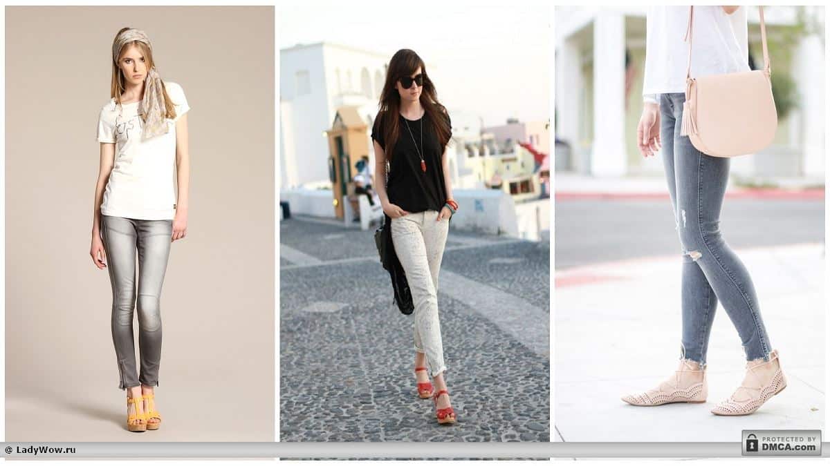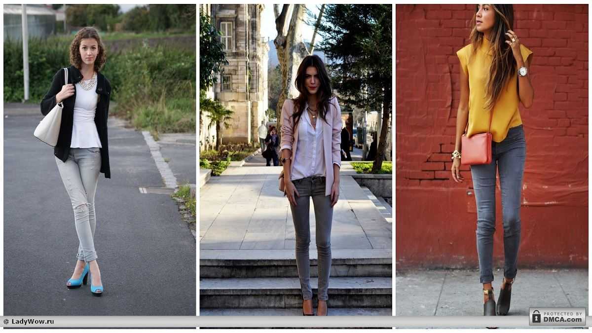 Блузки элегантного и женственного фасонов прекрасно подойдут к серым скинни. Облегающие джинсы и шелковая бардовая или фиолетовая блузка в тренде этого сезона. Актуальны блузы пастельных оттенков, отделанные кружевом, разлетайки.
