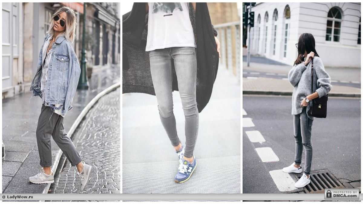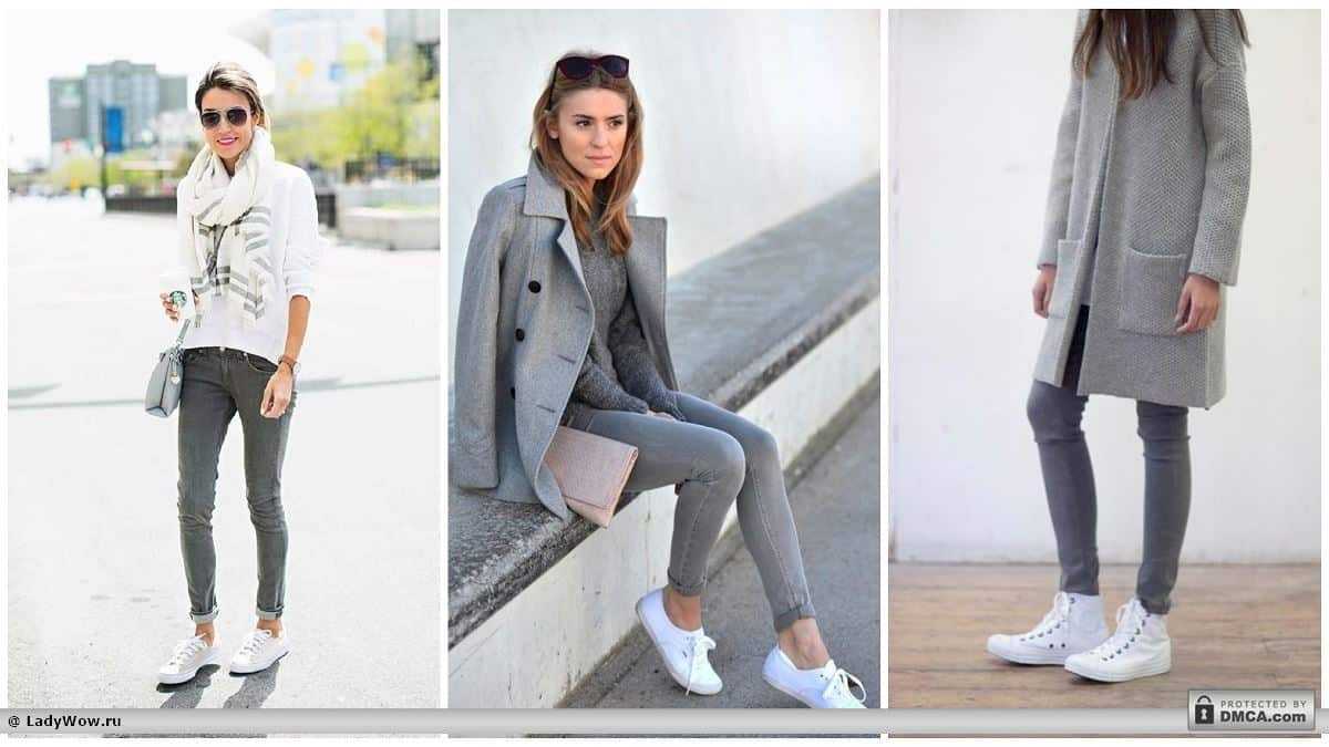 В тренде этого сезона белые кроссовки. Они гармонично смотрятся с серыми джинсами любого фасона. Бело-черная классика сочетается с джинсами любого фасона и всегда остается актуальной.