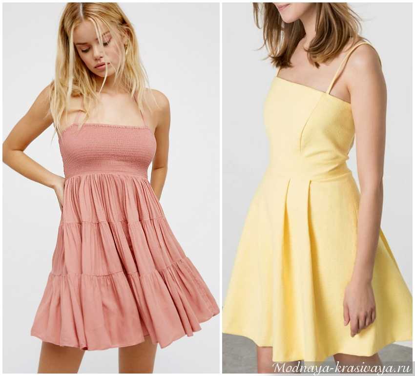 Свободные модели длиной до колена на широких бретелях можно считать универсальным решением и для пляжа, и для официальных мероприятий, и для романтических вечеров. Такие модели подходят любому типу фигуры, но наиболее гармонично выглядят они на «яблоках», поскольку способны аккуратно скрыть проблемную зону живота и чрезмерно выдающийся бюст.