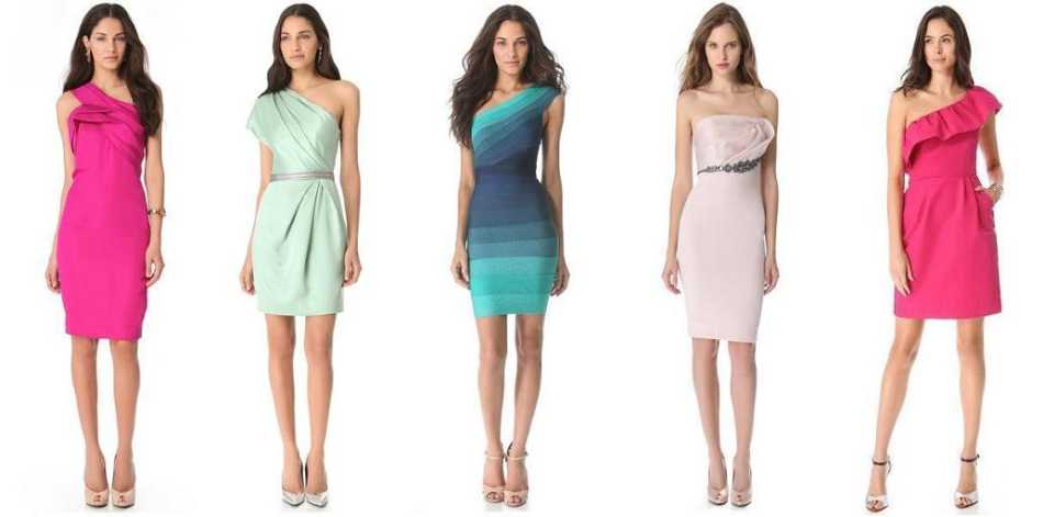 Платья следует выбирать однотонные, расклешенные от линии груди, слегка облегающие талию. Подчеркнуть образ можно аксессуарами