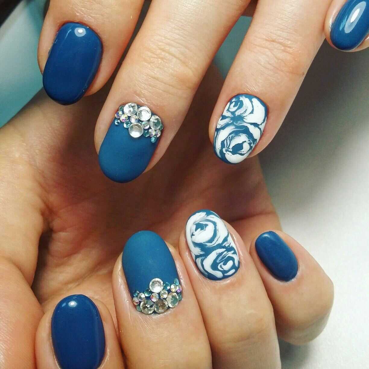 Синий маникюр будет выглядеть безупречно и роскошно на ноготках короткой длины, особенно если выполнить дизайн в утонченном матовом исполнении. Наиболее чарующе выглядят в матовом покрытии яркие тона синего цвета. В бархатном исполнении они смотрятся эффектнее и благороднее. Матовую текстуру можно использовать на всех ноготках, при этом разбавляя ненавязчивый дизайн стразами, камнями и другими элементами. Не менее привлекательно выглядит и выполнение нескольких пальчиков матовым тоном, а остальные — любой другой техникой. Для разнообразия дизайна можно нанести легкие глянцевые узоры на матовую поверхность синего цвета.