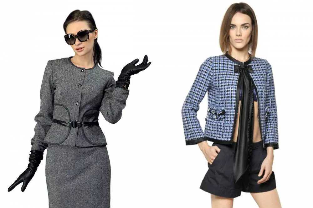 Классика вне времени — пиджаки в стиле Коко Шанель. Это укороченная модель с прямым кроем, небольшими карманами, без воротника, с зауженными рукавами.