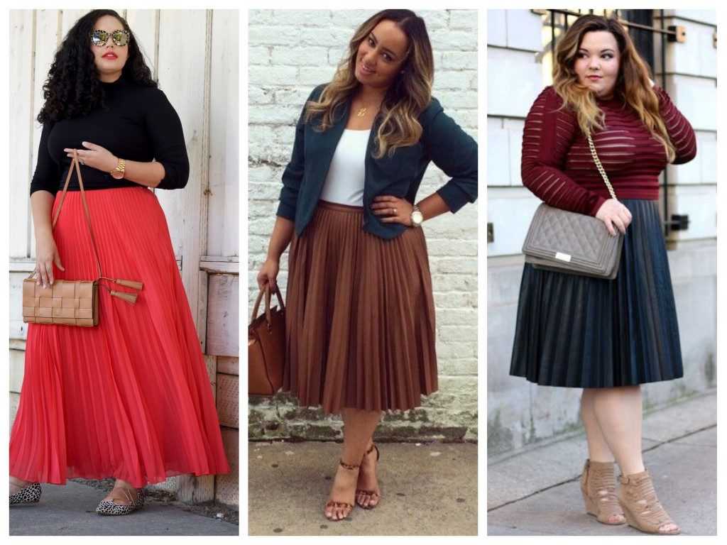 Плиссировка подходит полным женщинам благодаря вертикальным складкам, которые визуально делают фигуру стройнее. Этим эффектом обладают все юбки-плиссе, вне зависимости от длины, поэтому полным девушкам можно носить такие модели в повседневных комплектах.