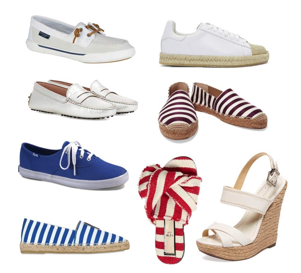 - Балетки. Еще один простой и стильный вариант, который прекрасно подойдет под любой выбранный морской стиль. Красные балетки создадут яркий акцент, а синие или бежевые подчеркнут яркие полоски на тельняшке;