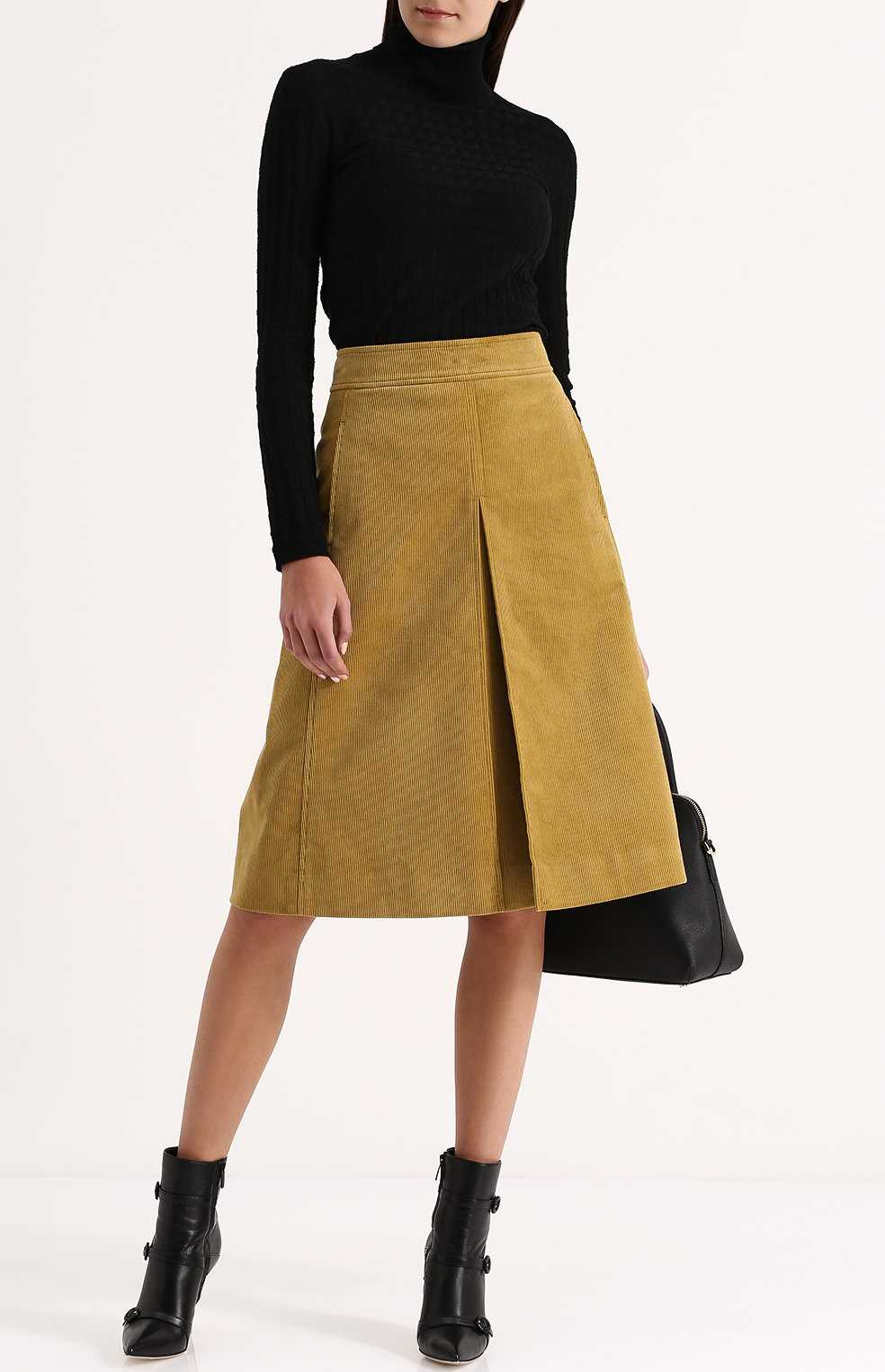 Вельветовая юбка на пуговицах спереди хорошо сочетается с облегающей водолазкой или объемным джемпером, а вниз лучше подобрать ботинки на маленьком каблуке или танкетке, близкие или одинаковые по цвету.
