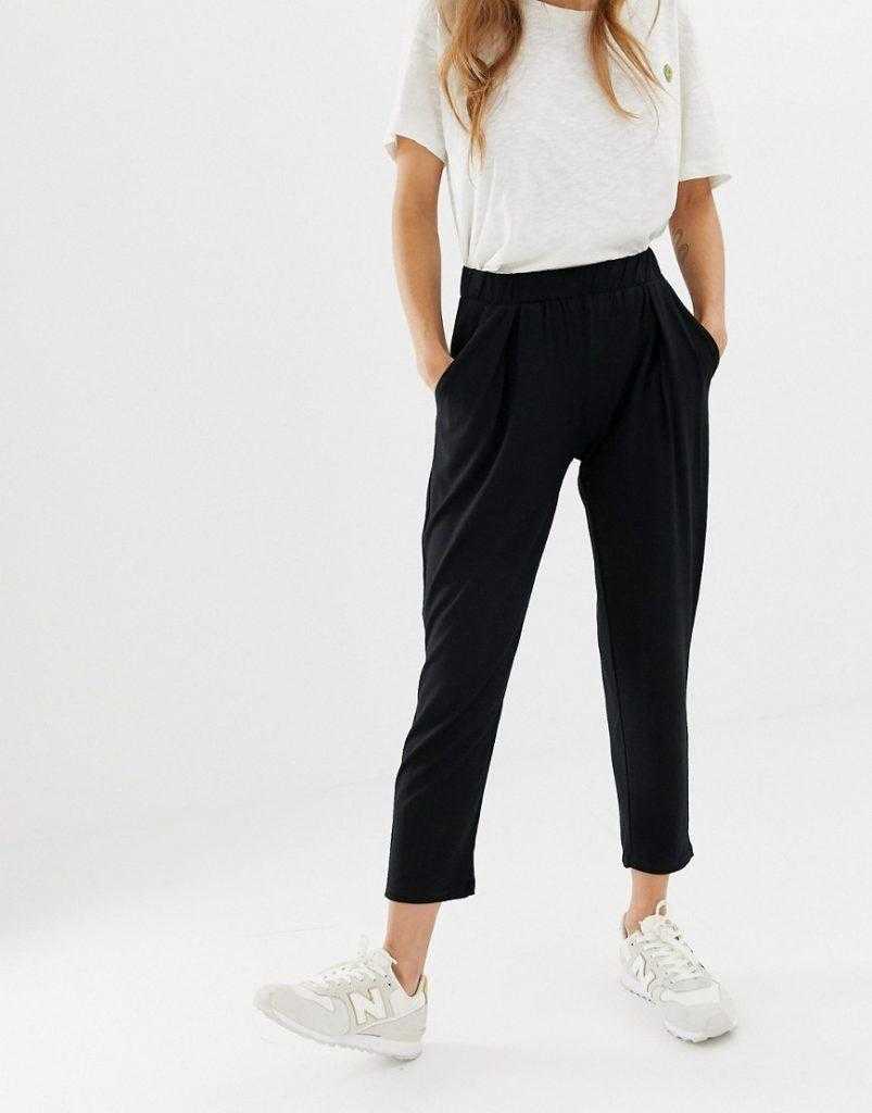 Напряженный темп жизни городских женщин вносит свои коррективы в их гардероб. С развитием уличной моды на смену классическим костюмам пришла удобная одежда. Однотонные штаны в сочетании с футболкой или майкой, дополненные кроссовками — вариант для повседневного лука.