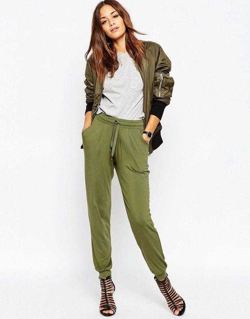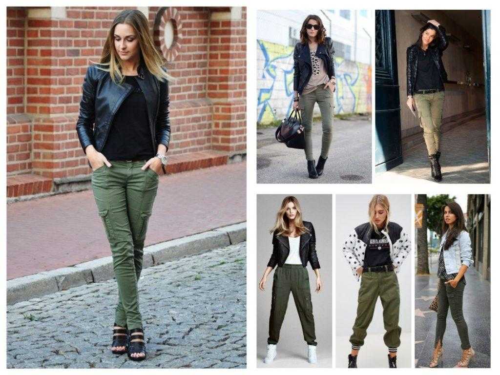 Карго – превосходное решение для создания композиции в стиле милитари. Для этого нужно подобрать темно-зеленые брюки или модель оттенка хаки. Что касается верхней части, отлично подойдет жакет в военном стиле, топ или блузка защитного оттенка. Если хочется выглядеть более нежно, стоит выбрать лаконичную трикотажную кофту или водолазку.