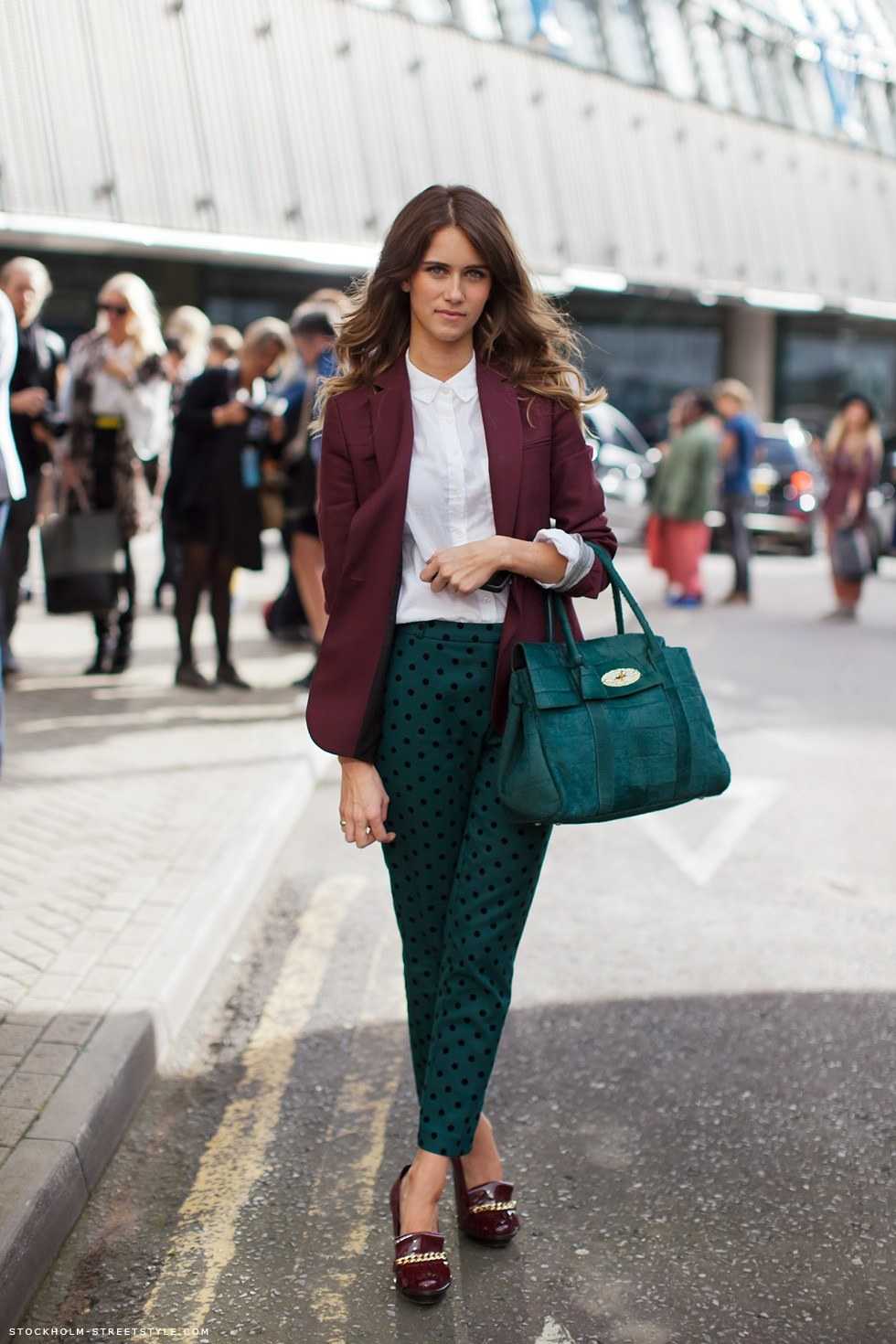 Для создания стильного полустрогого образа, который подойдет и для работы и для прогулки советуем примерить синий тотал-лук, т.е. вместе с брюками цвета виолы (или менее яркого цвета) следует надеть синюю рубашку или блузку (вполне уместен цветочный принт), накинув сверху синий пиджак. Не бойтесь обилия одного цвета, аксессуары и сумка тоже могут быть blue. Только туфли лучше выбрать черные лакированные. Более классический вариант — это конечно же белая, черная, кремовая блузка.